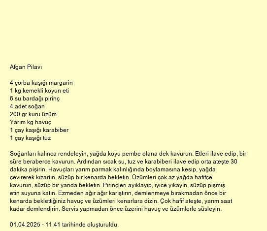 Soğanları kalınca rendeleyin, yağda koyu pembe olana dek kavurun. Etleri ilave edip, bir süre beraberce kavurun. Ardından sıcak su, tuz ve karabiberi ilave edip orta ateşte 30 dakika pişirin. Havuçları yarım parmak kalınlığında boylamasına kesip, yağda çevirerek kızartın, süzüp bir kenarda bekletin. Üzümleri çok az yağda hafifçe kavurun, süzüp bir yanda bekletin. Pirinçleri ayıklayıp, iyice yıkayın, süzüp pişmiş etin suyuna katın. Ezmeden ağır ağır karıştırın, demlenmeye bırakmadan önce bir kenarda beklettiğiniz havuç ve üzümleri kenarlara dizin. Çok hafif ateşte, yarım saat kadar demlendirin. Servis yapmadan önce üzerini havuç ve üzümlerle süsleyin.