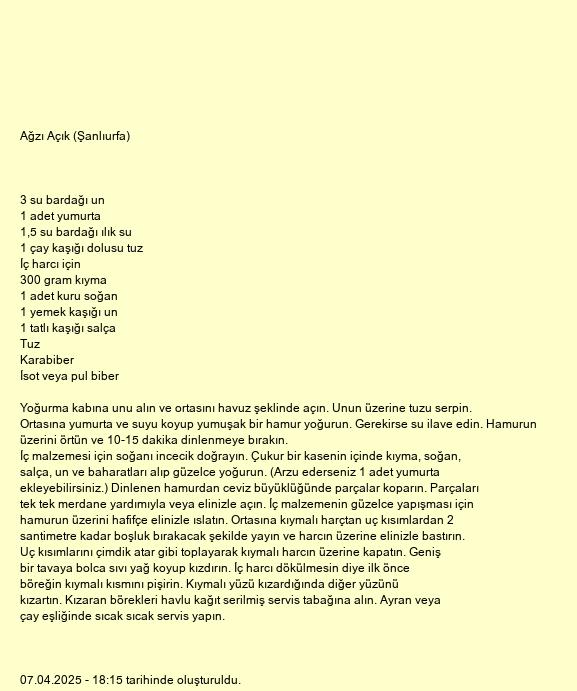 İç malzemesi için soğanı incecik doğrayın. Çukur bir kasenin içinde kıyma, soğan, salça, un ve baharatları alıp güzelce yoğurun. (Arzu ederseniz 1 adet yumurta ekleyebilirsiniz.) Dinlenen hamurdan ceviz büyüklüğünde parçalar koparın. Parçaları tek tek merdane yardımıyla veya elinizle açın. İç malzemenin güzelce yapışması için hamurun üzerini hafifçe elinizle ıslatın. Ortasına kıymalı harçtan uç kısımlardan 2 santimetre kadar boşluk bırakacak şekilde yayın ve harcın üzerine elinizle bastırın. Uç kısımlarını çimdik atar gibi toplayarak kıymalı harcın üzerine kapatın. Geniş bir tavaya bolca sıvı yağ koyup kızdırın. İç harcı dökülmesin diye ilk önce böreğin kıymalı kısmını pişirin. Kıymalı yüzü kızardığında diğer yüzünü kızartın. Kızaran börekleri havlu kağıt serilmiş servis tabağına alın. Ayran veya çay eşliğinde sıcak sıcak servis yapın.