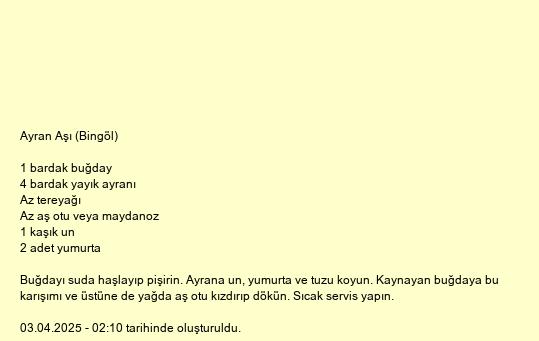 Buğdayı suda haşlayıp pişirin. Ayrana un, yumurta ve tuzu koyun. Kaynayan buğdaya bu karışımı ve üstüne de yağda aş otu kızdırıp dökün. Sıcak servis yapın.