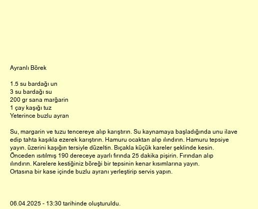 Su, margarin ve tuzu tencereye alıp karıştırın. Su kaynamaya başladığında unu ilave edip tahta kaşıkla ezerek karıştırın. Hamuru ocaktan alıp ılındırın. Hamuru tepsiye yayın. üzerini kaşığın tersiyle düzeltin. Bıçakla küçük kareler şeklinde kesin. Önceden ısıtılmış 190 dereceye ayarlı fırında 25 dakika pişirin. Fırından alıp ılındırın. Karelere kestiğiniz böreği bir tepsinin kenar kısımlarına yayın. Ortasına bir kase içinde buzlu ayranı yerleştirip servis yapın.