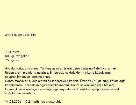 Ayvaları ortadan yarınız. Yarılmış ayvaları tekrar uzunlamasına 4 defa yarıp 4'er üçgen biçim meydana getiriniz. Bir bıçakla çekirdeklerini çıkarıp kabuklarını soyarak bir suyun içersine atınız.