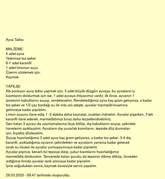 Ayvalar pişince, kenarlı bir tepsiye dizip, çukur kısımlarını hazırladığımız marmelâtla dolduralım. Tencerede kalan şurubu da tepsinin dibine döküp, önceden ısıttığımız fırında ayvalar renk alıncaya kadar pişirelim.