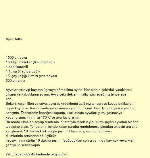Bu arada elmaları soyup rendenin iri tarafıyla rendeleyin. Yumuşayan ayvaları bir fırın tepsisine dizin. Tencerenin içinde kalan şuruba rendelenmiş elmaları ekleyip ara sıra karıştırarak 10 dakika kısık ateşte pişirin. Hazırladığınız bu harcı ayva dilimlerinin ortalarına bölüştürün.