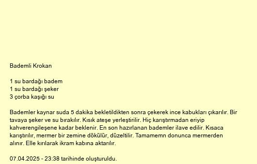 Bademler kaynar suda 5 dakika bekletildikten sonra çekerek ince kabukları çıkarılır. Bir tavaya şeker ve su bırakılır. Kısık ateşe yerleştirilir. Hiç karıştırmadan eriyip kahverengileşene kadar beklenir. En son hazırlanan bademler ilave edilir. Kısaca karıştırılır, mermer bir zemine dökülür, düzeltilir. Tamamemn donunca mermerden alınır. Elle kırılarak ikram kabına aktarılır.