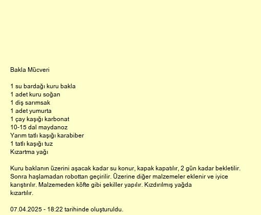 Kuru baklanın üzerini aşacak kadar su konur, kapak kapatılır, 2 gün kadar bekletilir. Sonra haşlamadan robottan geçirilir. Üzerine diğer malzemeler eklenir ve iyice karıştırılır. Malzemeden köfte gibi şekiller yapılır. Kızdırılmış yağda kızartılır.