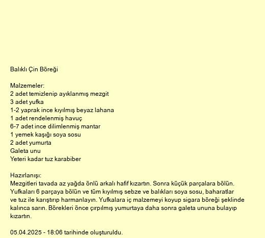 Mezgitleri tavada az yağda önlü arkalı hafif kızartın. Sonra küçük parçalara bölün. Yufkaları 6 parçaya bölün ve tüm kıyılmış sebze ve balıkları soya sosu, baharatlar ve tuz ile karıştırıp harmanlayın. Yufkalara iç malzemeyi koyup sigara böreği şeklinde kalınca sarın. Börekleri önce çırpılmış yumurtaya daha sonra galeta ununa bulayıp kızartın.