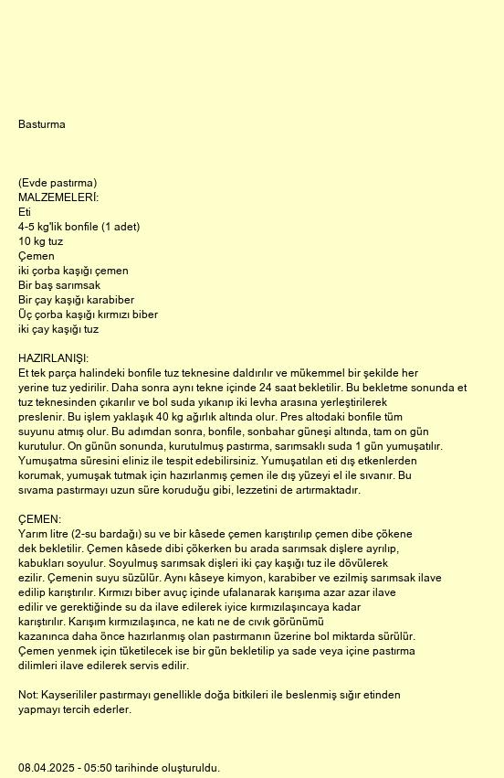 Not: Kayserililer pastırmayı genellikle doğa bitkileri ile beslenmiş sığır etinden yapmayı tercih ederler.