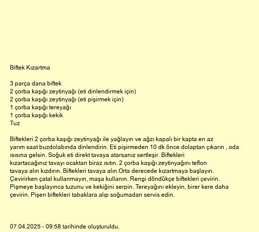 Biftekleri 2 çorba kaşığı zeytinyağı ile yağlayın ve ağzı kapalı bir kapta en az yarım saat buzdolabında dinlendirin. Eti pişirmeden 10 dk önce dolaptan çıkarın , oda ısısına gelsin. Soğuk eti direkt tavaya atarsanız sertleşir. Biftekleri kızartacağınız tavayı ocaktan biraz ısıtın. 2 çorba kaşığı zeytinyağını teflon tavaya alın kızdırın. Biftekleri tavaya alın.Orta derecede kızartmaya başlayın. Çevirirken çatal kullanmayın, maşa kullanın. Rengi döndükçe biftekleri çevirin. Pişmeye başlayınca tuzunu ve kekiğini serpin. Tereyağını ekleyin, birer kere daha çevirin. Pişen biftekleri tabaklara alıp soğumadan servis edin.