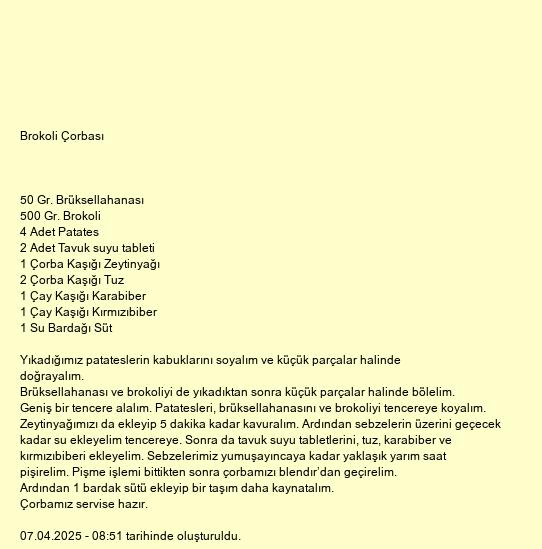 Geniş bir tencere alalım. Patatesleri, brüksellahanasını ve brokoliyi tencereye koyalım. Zeytinyağımızı da ekleyip 5 dakika kadar kavuralım. Ardından sebzelerin üzerini geçecek kadar su ekleyelim tencereye. Sonra da tavuk suyu tabletlerini, tuz, karabiber ve kırmızıbiberi ekleyelim. Sebzelerimiz yumuşayıncaya kadar yaklaşık yarım saat pişirelim. Pişme işlemi bittikten sonra çorbamızı blendır’dan geçirelim. Ardından 1 bardak sütü ekleyip bir taşım daha kaynatalım.