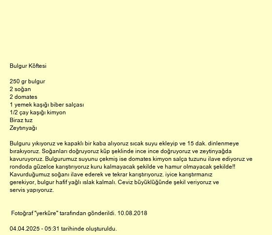 Bulguru yıkıyoruz ve kapaklı bir kaba alıyoruz sıcak suyu ekleyip ve 15 dak. dinlenmeye bırakıyoruz. Soğanları doğruyoruz küp şeklinde ince ince doğruyoruz ve zeytinyağda kavuruyoruz. Bulgurumuz suyunu çekmiş ise domates kimyon salça tuzunu ilave ediyoruz ve rondoda güzelce karıştırıyoruz kuru kalmayacak şekilde ve hamur olmayacak şekilde!! Kavurduğumuz soğanı ilave ederek ve tekrar karıştırıyoruz. iyice karıştırmanız gerekiyor, bulgur hafif yağlı ıslak kalmalı. Ceviz büyüklüğünde şekil veriyoruz ve servis yapıyoruz.