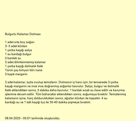 3 adet kalamar, tuzla ovulup temizlenir. Dolmanın iç harcı için; bir tencerede 3 çorba kaşığı margarini ve ince ince doğranmış soğanlar kavrulur. Salça, bulgur ve dolmalık fıstık eklendikten sonra, 5 dakika daha kavrulur. 1 bardak sıcak su ilave edilir ve kavurma işlemine devam edilir. Tüm baharatlar eklendikten sonra, soğumaya bırakılır. Temizlenmiş kalamarın içine, harç doldurulduktan sonra, ağızları kürdan ile kapatılır. 4 su bardağı su ve 1 tatlı kaşığı tuz ile 35-40 dakika pişmeye bırakılır.