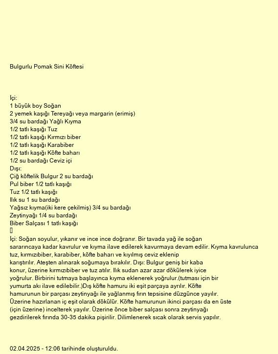 İçi: Soğan soyulur, yıkanır ve ince ince doğranır. Bir tavada yağ ile soğan sararıncaya kadar kavrulur ve kıyma ilave edilerek kavurmaya devam edilir. Kıyma kavrulunca tuz, kırmızıbiber, karabiber, köfte baharı ve kıyılmış ceviz eklenip karıştırılır. Ateşten alınarak soğumaya bırakılır. Dışı: Bulgur geniş bir kaba konur, üzerine kırmızıbiber ve tuz atılır. Ilık sudan azar azar dökülerek iyice yoğrulur. Birbirini tutmaya başlayınca kıyma eklenerek yoğrulur.(tutması için bir yumurta akı ilave edilebilir.)Dış köfte hamuru iki eşit parçaya ayrılır. Köfte hamurunun bir parçası zeytinyağı ile yağlanmış fırın tepsisine düzgünce yayılır. Üzerine hazırlanan iç eşit olarak dökülür. Köfte hamurunun ikinci parçası da en üste (için üzerine) incelterek yayılır. Üzerine önce biber salçası sonra zeytinyağı gezdirilerek fırında 30-35 dakika pişirilir. Dilimlenerek sıcak olarak servis yapılır.