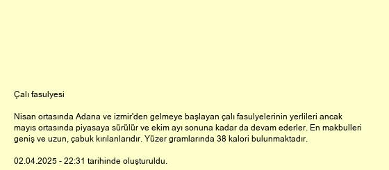 Nisan ortasında Adana ve izmir'den gelmeye başlayan çalı fasulyelerinin yerlileri ancak mayıs ortasında piyasaya sürülür ve ekim ayı sonuna kadar da devam ederler. En makbulleri geniş ve uzun, çabuk kırılanlarıdır. Yüzer gramlarında 38 kalori bulunmaktadır.