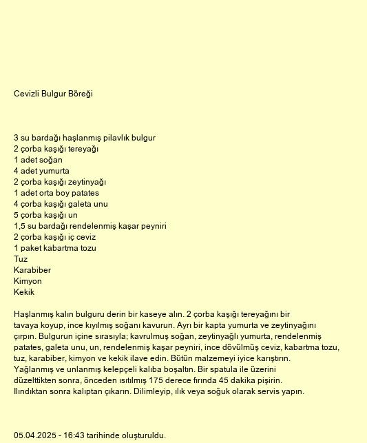 Haşlanmış kalın bulguru derin bir kaseye alın. 2 çorba kaşığı tereyağını bir tavaya koyup, ince kıyılmış soğanı kavurun. Ayrı bir kapta yumurta ve zeytinyağını çırpın. Bulgurun içine sırasıyla; kavrulmuş soğan, zeytinyağlı yumurta, rendelenmiş patates, galeta unu, un, rendelenmiş kaşar peyniri, ince dövülmüş ceviz, kabartma tozu, tuz, karabiber, kimyon ve kekik ilave edin. Bütün malzemeyi iyice karıştırın. Yağlanmış ve unlanmış kelepçeli kalıba boşaltın. Bir spatula ile üzerini düzelttikten sonra, önceden ısıtılmış 175 derece fırında 45 dakika pişirin. Ilındıktan sonra kalıptan çıkarın. Dilimleyip, ılık veya soğuk olarak servis yapın.
