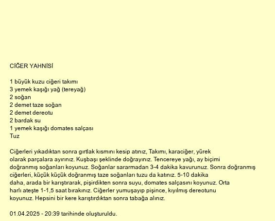 Ciğerleri yıkadıktan sonra gırtlak kısmını kesip atınız, Takımı, karaciğer, yürek olarak parçalara ayırınız. Kuşbaşı şeklinde doğrayınız. Tencereye yağı, ay biçimi doğranmış soğanları koyunuz. Soğanlar sararmadan 3-4 dakika kavurunuz. Sonra doğranmış ciğerleri, küçük küçük doğranmış taze soğanları tuzu da katınız. 5-10 dakika daha, arada bir karıştırarak, pişirdikten sonra suyu, domates salçasını koyunuz. Orta harlı ateşte 1-1,5 saat bırakınız. Ciğerler yumuşayıp pişince, kıyılmış dereotunu koyunuz. Hepsini bir kere karıştırdıktan sonra tabağa alınız.