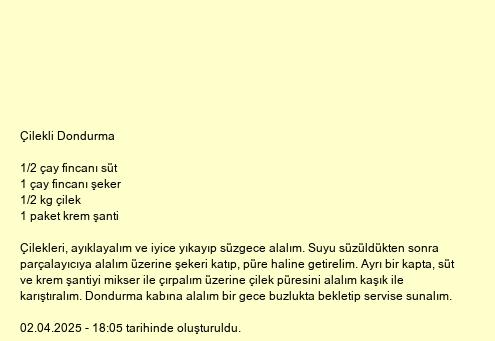 Çilekleri, ayıklayalım ve iyice yıkayıp süzgece alalım. Suyu süzüldükten sonra parçalayıcıya alalım üzerine şekeri katıp, püre haline getirelim. Ayrı bir kapta, süt ve krem şantiyi mikser ile çırpalım üzerine çilek püresini alalım kaşık ile karıştıralım. Dondurma kabına alalım bir gece buzlukta bekletip servise sunalım.