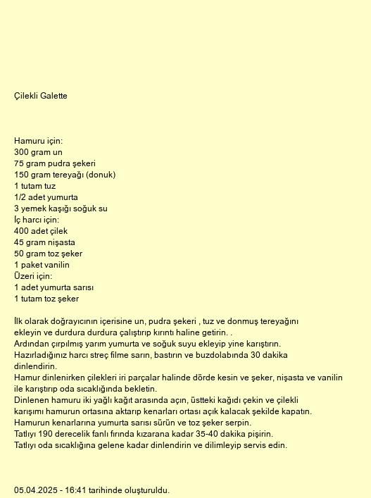 Dinlenen hamuru iki yağlı kağıt arasında açın, üstteki kağıdı çekin ve çilekli karışımı hamurun ortasına aktarıp kenarları ortası açık kalacak şekilde kapatın.