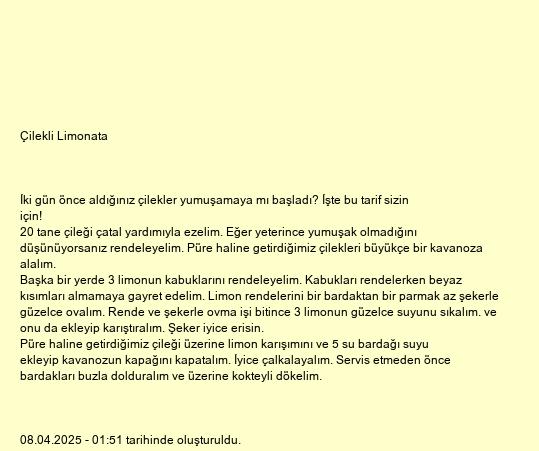 Püre haline getirdiğimiz çileği üzerine limon karışımını ve 5 su bardağı suyu ekleyip kavanozun kapağını kapatalım. İyice çalkalayalım. Servis etmeden önce bardakları buzla dolduralım ve üzerine kokteyli dökelim.