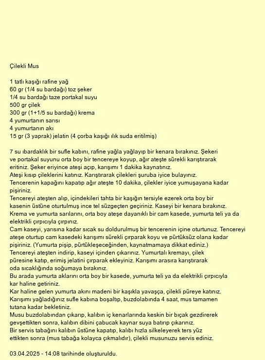 Bir servis tabağını kalıbın üstüne kapatıp, kalıbı hızla silkeleyerek ters yüz ettikten sonra (mus tabağa kolayca çıkmalıdır), çilekli musunuzu servis ediniz.