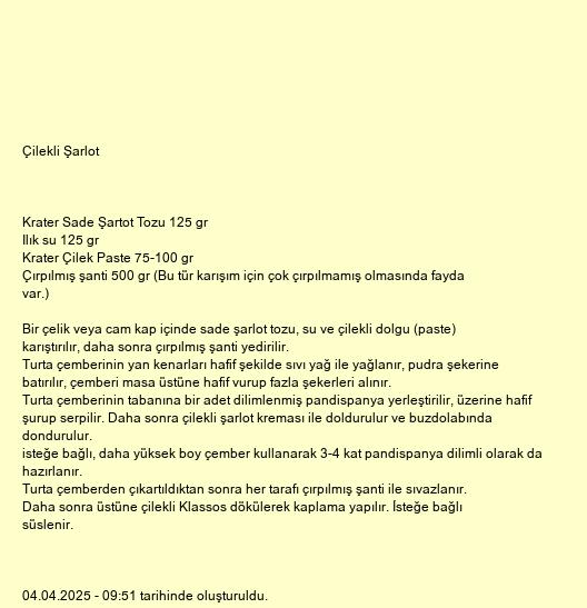Turta çemberinin tabanına bir adet dilimlenmiş pandispanya yerleştirilir, üzerine hafif şurup serpilir. Daha sonra çilekli şarlot kreması ile doldurulur ve buzdolabında dondurulur.