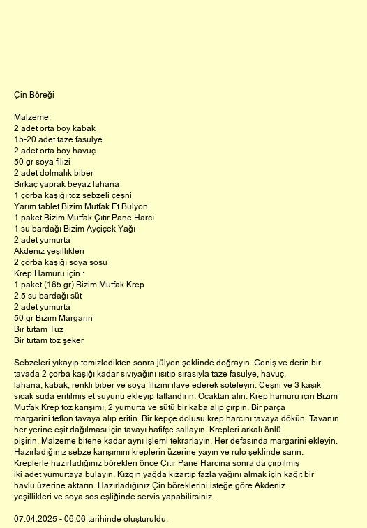 Sebzeleri yıkayıp temizledikten sonra jülyen şeklinde doğrayın. Geniş ve derin bir tavada 2 çorba kaşığı kadar sıvıyağını ısıtıp sırasıyla taze fasulye, havuç, lahana, kabak, renkli biber ve soya filizini ilave ederek soteleyin. Çeşni ve 3 kaşık sıcak suda eritilmiş et suyunu ekleyip tatlandırın. Ocaktan alın. Krep hamuru için Bizim Mutfak Krep toz karışımı, 2 yumurta ve sütü bir kaba alıp çırpın. Bir parça margarini teflon tavaya alıp eritin. Bir kepçe dolusu krep harcını tavaya dökün. Tavanın her yerine eşit dağılması için tavayı hafifçe sallayın. Krepleri arkalı önlü pişirin. Malzeme bitene kadar aynı işlemi tekrarlayın. Her defasında margarini ekleyin. Hazırladığınız sebze karışımını kreplerin üzerine yayın ve rulo şeklinde sarın. Kreplerle hazırladığınız börekleri önce Çıtır Pane Harcına sonra da çırpılmış iki adet yumurtaya bulayın. Kızgın yağda kızartıp fazla yağını almak için kağıt bir havlu üzerine aktarın. Hazırladığınız Çin böreklerini isteğe göre Akdeniz yeşillikleri ve soya sos eşliğinde servis yapabilirsiniz.