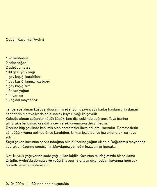 Not: Kuyruk yağı yerine sade yağ kullanılabilir. Kavurma mutfağımızda bir saklama türüdür. Aydın’da domates ve yoğurt ilavesi ile ortaya çıkançoban kavurma hem çok lezzetli hem de besleyicidir.