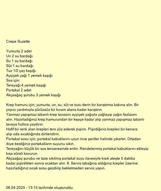 Akçaağaç şurubu ve taze sıkılmış portakal suyu ilavesiyle kısık ateşte 5 dakika kadar pişirdikten sonra ocaktan alın. 8. Servis tabağına aldığınız krepler üzerine hazırladığınız sıcak sosu gezdirip bekletmeden servis yapın.