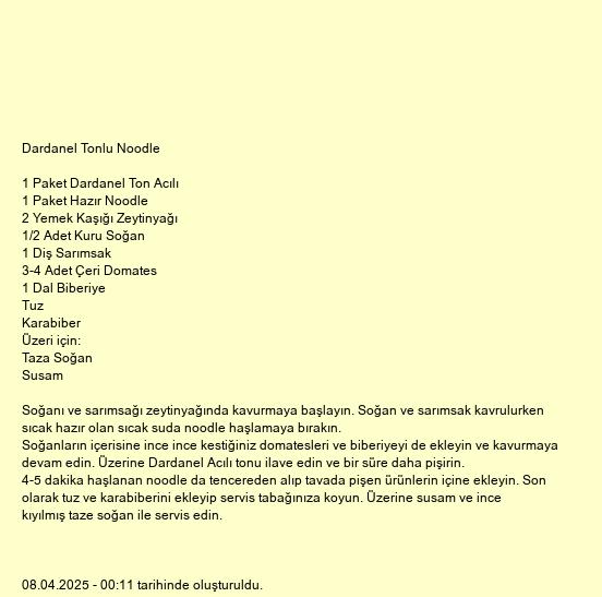 4-5 dakika haşlanan noodle da tencereden alıp tavada pişen ürünlerin içine ekleyin. Son olarak tuz ve karabiberini ekleyip servis tabağınıza koyun. Üzerine susam ve ince kıyılmış taze soğan ile servis edin.