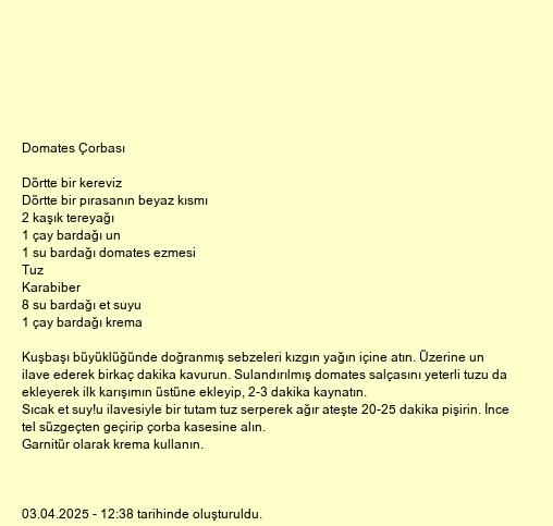 Sıcak et suy!u ilavesiyle bir tutam tuz serperek ağır ateşte 20-25 dakika pişirin. İnce tel süzgeçten geçirip çorba kasesine alın.