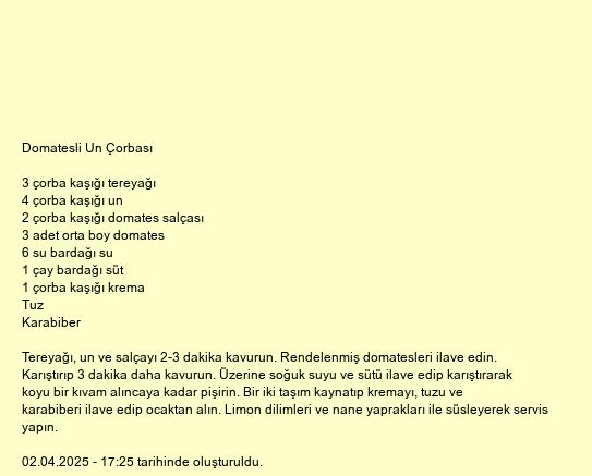 Tereyağı, un ve salçayı 2-3 dakika kavurun. Rendelenmiş domatesleri ilave edin. Karıştırıp 3 dakika daha kavurun. Üzerine soğuk suyu ve sütü ilave edip karıştırarak koyu bir kıvam alıncaya kadar pişirin. Bir iki taşım kaynatıp kremayı, tuzu ve karabiberi ilave edip ocaktan alın. Limon dilimleri ve nane yaprakları ile süsleyerek servis yapın.