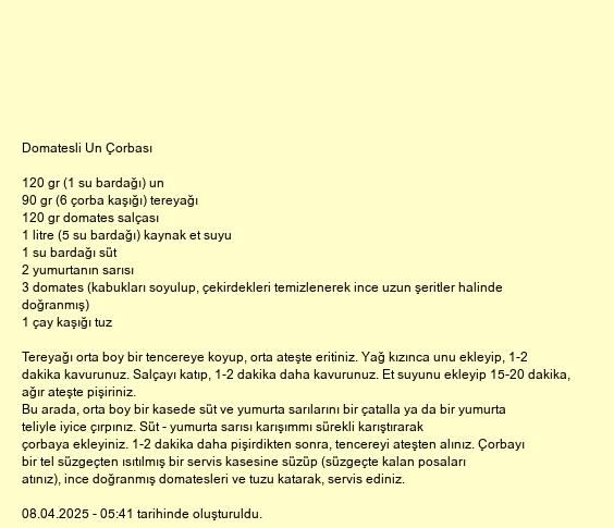 Bu arada, orta boy bir kasede süt ve yumurta sarılarını bir çatalla ya da bir yumurta teliyle iyice çırpınız. Süt - yumurta sarısı karışımmı sürekli karıştırarak çorbaya ekleyiniz. 1-2 dakika daha pişirdikten sonra, tencereyi ateşten alınız. Çorbayı bir tel süzgeçten ısıtılmış bir servis kasesine süzüp (süzgeçte kalan posaları atınız), ince doğranmış domatesleri ve tuzu katarak, servis ediniz.