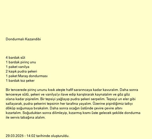 Bir tencerede pirinç ununu kısık ateşte hafif sararıncaya kadar kavuralım. Daha sonra tencereye sütü, şekeri ve vanilya'yı ilave edip karıştırarak kaynatalım ve göz göz olana kadar pişirelim. Bir tepsiyi yağlayıp pudra şekeri serpelim. Tepsiyi un eler gibi sallayarak, pudra şekerini tepsinin her tarafına yayalım. Üzerine pişirdiğimiz tatlıyı döküp soğumaya bırakalım. Daha sonra ocağın üstünde çevire çevire altını kızartalım. Soğuduktan sonra dilimleyip, kızarmış kısmı üste gelecek şekilde dondurma ile servis tabağına alalım.