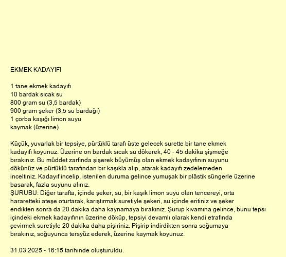 ŞURUBU: Diğer tarafta, içinde şeker, su, bir kaşık limon suyu olan tencereyi, orta hararetteki ateşe oturtarak, karıştırmak suretiyle şekeri, su içinde eritiniz ve şeker eridikten sonra da 20 dakika daha kaynamaya bırakınız. Şurup kıvamına gelince, bunu tepsi içindeki ekmek kadayıfının üzerine döküp, tepsiyi devamlı olarak kendi etrafında çevirmek suretiyle 20 dakika daha pişiriniz. Pişirip indirdikten sonra soğumaya bırakınız, soğuyunca tersyüz ederek, üzerine kaymak koyunuz.