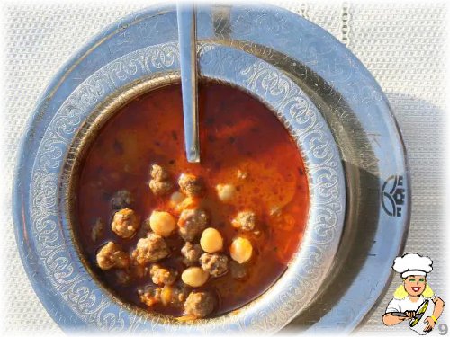 Birkaç dakika daha kavrulan soğan ve köftelerin üzerine kaynamış su, tuz, nohutlar eklenerek kaynamaya bırakılır.
