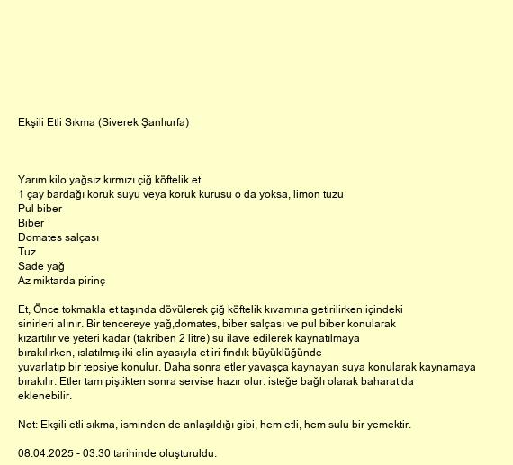 Not: Ekşili etli sıkma, isminden de anlaşıldığı gibi, hem etli, hem sulu bir yemektir.