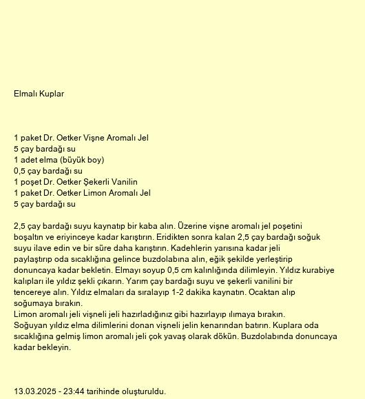 Limon aromalı jeli vişneli jeli hazırladığınız gibi hazırlayıp ılımaya bırakın. Soğuyan yıldız elma dilimlerini donan vişneli jelin kenarından batırın. Kuplara oda sıcaklığına gelmiş limon aromalı jeli çok yavaş olarak dökün. Buzdolabında donuncaya kadar bekleyin.