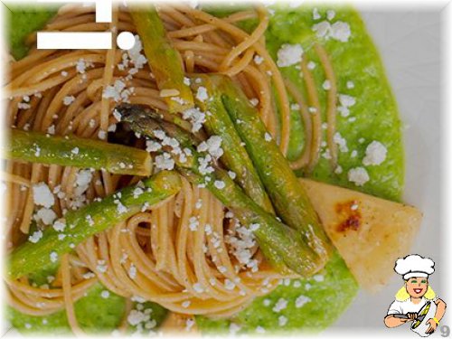 Enginarlı Kepekli Spaghettiyi bezelye sosu ve lor peyniri ile birlikte servis ediyoruz.