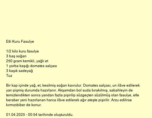 Bir kap içinde yağ, et, kesilmiş soğan kavrulur. Domates salçası, un ilâve edilerek yarı pişmiş durumda hazırlanır. Akşamdan bol suda bırakılmış, sabahleyin de temizlendikten sonra yandan fazla pişirilip süzgeçten süzülmüş olan fasulye, etle beraber yeni hazırlanan harca ilâve edilerek ağır ateşte pişirilir. Arzu edilirse kırmızıbiber de konur.