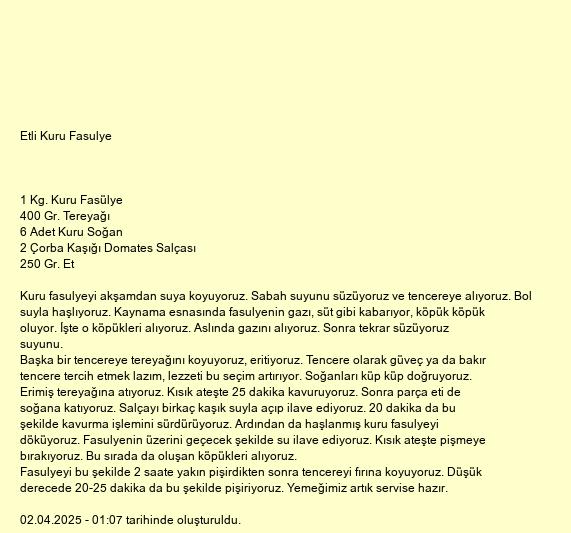 Başka bir tencereye tereyağını koyuyoruz, eritiyoruz. Tencere olarak güveç ya da bakır tencere tercih etmek lazım, lezzeti bu seçim artırıyor. Soğanları küp küp doğruyoruz. Erimiş tereyağına atıyoruz. Kısık ateşte 25 dakika kavuruyoruz. Sonra parça eti de soğana katıyoruz. Salçayı birkaç kaşık suyla açıp ilave ediyoruz. 20 dakika da bu şekilde kavurma işlemini sürdürüyoruz. Ardından da haşlanmış kuru fasulyeyi döküyoruz. Fasulyenin üzerini geçecek şekilde su ilave ediyoruz. Kısık ateşte pişmeye bırakıyoruz. Bu sırada da oluşan köpükleri alıyoruz.