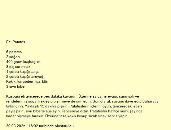 Kuşbaşı eti tencerede beş dakika kavurun. Üzerine salça, tereyağı, sarımsak ve rendelenmiş soğanı ekleyip pişirmeye devam edin. Son olarak suyunu ilave edip baharatla tatlandırın. Yaklaşık 15 dakika pişirin. Patateslerin içlerini oyun, tenceredeki etleri paylaştırın, sivri biberle süsleyin. Tencereye dizin. Patatesler hafifçe yumuşayınca kadar pişmeye bırakın. Üzerine taze kekik koyup sıcak sıcak servis yapın.