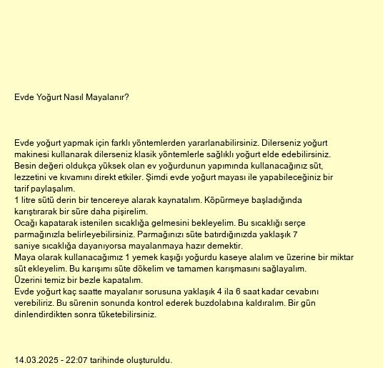Evde yoğurt yapmak için farklı yöntemlerden yararlanabilirsiniz. Dilerseniz yoğurt makinesi kullanarak dilerseniz klasik yöntemlerle sağlıklı yoğurt elde edebilirsiniz. Besin değeri oldukça yüksek olan ev yoğurdunun yapımında kullanacağınız süt, lezzetini ve kıvamını direkt etkiler. Şimdi evde yoğurt mayası ile yapabileceğiniz bir tarif paylaşalım.