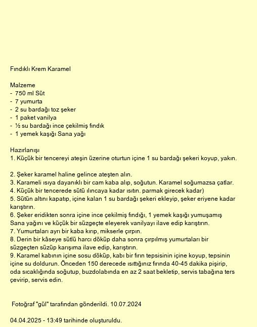 9. Karamel kabının içine sosu döküp, kabı bir fırın tepsisinin içine koyup, tepsinin içine su doldurun. Önceden 150 derecede ısıttığınız fırında 40-45 dakika pişirip, oda sıcaklığında soğutup, buzdolabında en az 2 saat bekletip, servis tabağına ters çevirip, servis edin.