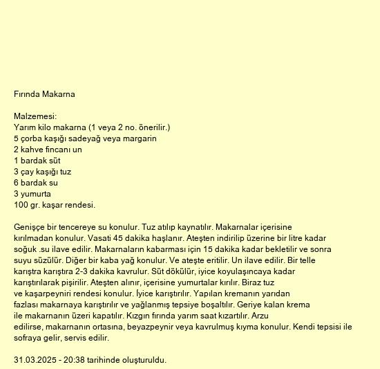 Genişçe bir tencereye su konulur. Tuz atılıp kaynatılır. Makarnalar içerisine kırılmadan konulur. Vasati 45 dakika haşlanır. Ateşten indirilip üzerine bir litre kadar soğuk .su ilave edilir. Makarnaların kabarması için 15 dakika kadar bekletilir ve sonra suyu süzülür. Diğer bir kaba yağ konulur. Ve ateşte eritilir. Un ilave edilir. Bir telle karıştra karıştıra 2-3 dakika kavrulur. Süt dökülür, iyice koyulaşıncaya kadar karıştırılarak pişirilir. Ateşten alınır, içerisine yumurtalar kırılır. Biraz tuz ve kaşarpeyniri rendesi konulur. İyice karıştırılır. Yapılan kremanın yarıdan fazlası makarnaya karıştırılır ve yağlanmış tepsiye boşaltılır. Geriye kalan krema ile makarnanın üzeri kapatılır. Kızgın fırında yarım saat kızartılır. Arzu edilirse, makarnanın ortasına, beyazpeynir veya kavrulmuş kıyma konulur. Kendi tepsisi ile sofraya gelir, servis edilir.