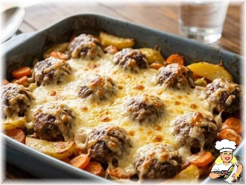 Kıyma, rendelenmiş soğan, yumurta, galeta unu ve baharatları yoğurup köfte hazırlayın. Patates ve havucu dilimleyin. Fırın kabına sebzeleri yerleştirip köfteleri üzerine dizin. 180 derece fırında yaklaşık 30 dakika pişirin. Üzerine kaşar peyniri serpip 5 dakika daha fırında tutun.