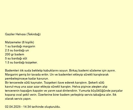 Bir tencerede sütü kaynatın. Tozşekeri ilave ederek karıştırın. Şekerli sütü kavrul-muş una azar azar ekleyip sürekli karıştın. Helva pişince ateşten alıp tencerenin kapağını kapatın ve yarım saat dinlendirin. Yumurta büyüklüğünde parçalar koparıp oval şekil verin. Üzerlerine birer badem yerleştirip servis tabağına alın. Ilık olarak servis yapın.