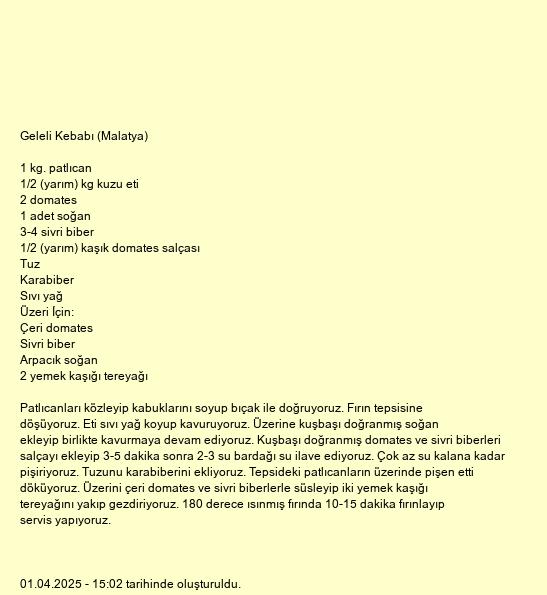 Patlıcanları közleyip kabuklarını soyup bıçak ile doğruyoruz. Fırın tepsisine döşüyoruz. Eti sıvı yağ koyup kavuruyoruz. Üzerine kuşbaşı doğranmış soğan ekleyip birlikte kavurmaya devam ediyoruz. Kuşbaşı doğranmış domates ve sivri biberleri salçayı ekleyip 3-5 dakika sonra 2-3 su bardağı su ilave ediyoruz. Çok az su kalana kadar pişiriyoruz. Tuzunu karabiberini ekliyoruz. Tepsideki patlıcanların üzerinde pişen etti döküyoruz. Üzerini çeri domates ve sivri biberlerle süsleyip iki yemek kaşığı tereyağını yakıp gezdiriyoruz. 180 derece ısınmış fırında 10-15 dakika fırınlayıp servis yapıyoruz.