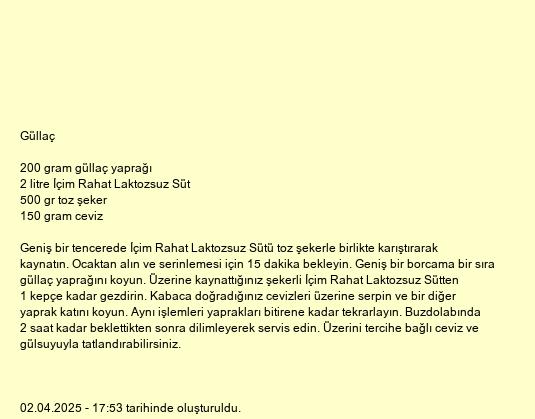 Geniş bir tencerede İçim Rahat Laktozsuz Sütü toz şekerle birlikte karıştırarak kaynatın. Ocaktan alın ve serinlemesi için 15 dakika bekleyin. Geniş bir borcama bir sıra güllaç yaprağını koyun. Üzerine kaynattığınız şekerli İçim Rahat Laktozsuz Sütten 1 kepçe kadar gezdirin. Kabaca doğradığınız cevizleri üzerine serpin ve bir diğer yaprak katını koyun. Aynı işlemleri yaprakları bitirene kadar tekrarlayın. Buzdolabında 2 saat kadar beklettikten sonra dilimleyerek servis edin. Üzerini tercihe bağlı ceviz ve gülsuyuyla tatlandırabilirsiniz.