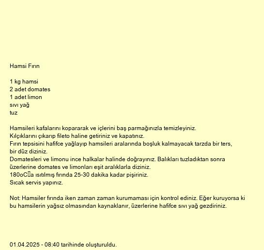 Not: Hamsiler fırında iken zaman zaman kurumaması için kontrol ediniz. Eğer kuruyorsa ki bu hamsilerin yağsız olmasından kaynaklanır, üzerlerine hafifce sıvı yağ gezdiriniz.