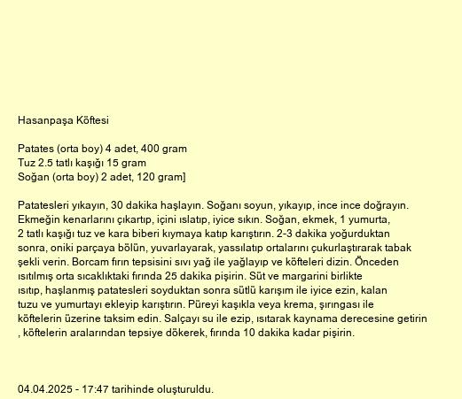 Patatesleri yıkayın, 30 dakika haşlayın. Soğanı soyun, yıkayıp, ince ince doğrayın. Ekmeğin kenarlarını çıkartıp, içini ıslatıp, iyice sıkın. Soğan, ekmek, 1 yumurta, 2 tatlı kaşığı tuz ve kara biberi kıymaya katıp karıştırın. 2-3 dakika yoğurduktan sonra, oniki parçaya bölün, yuvarlayarak, yassılatıp ortalarını çukurlaştırarak tabak şekli verin. Borcam fırın tepsisini sıvı yağ ile yağlayıp ve köfteleri dizin. Önceden ısıtılmış orta sıcaklıktaki fırında 25 dakika pişirin. Süt ve margarini birlikte ısıtıp, haşlanmış patatesleri soyduktan sonra sütlü karışım ile iyice ezin, kalan tuzu ve yumurtayı ekleyip karıştırın. Püreyi kaşıkla veya krema, şırıngası ile köftelerin üzerine taksim edin. Salçayı su ile ezip, ısıtarak kaynama derecesine getirin , köftelerin aralarından tepsiye dökerek, fırında 10 dakika kadar pişirin.