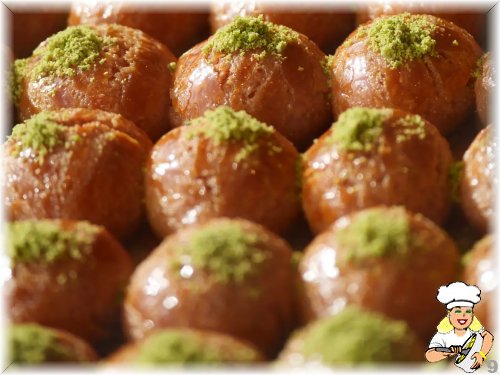 Tatlıları servis tabağına alıp üzerine Antep fıstığı veya Hindistan cevizi serpin.